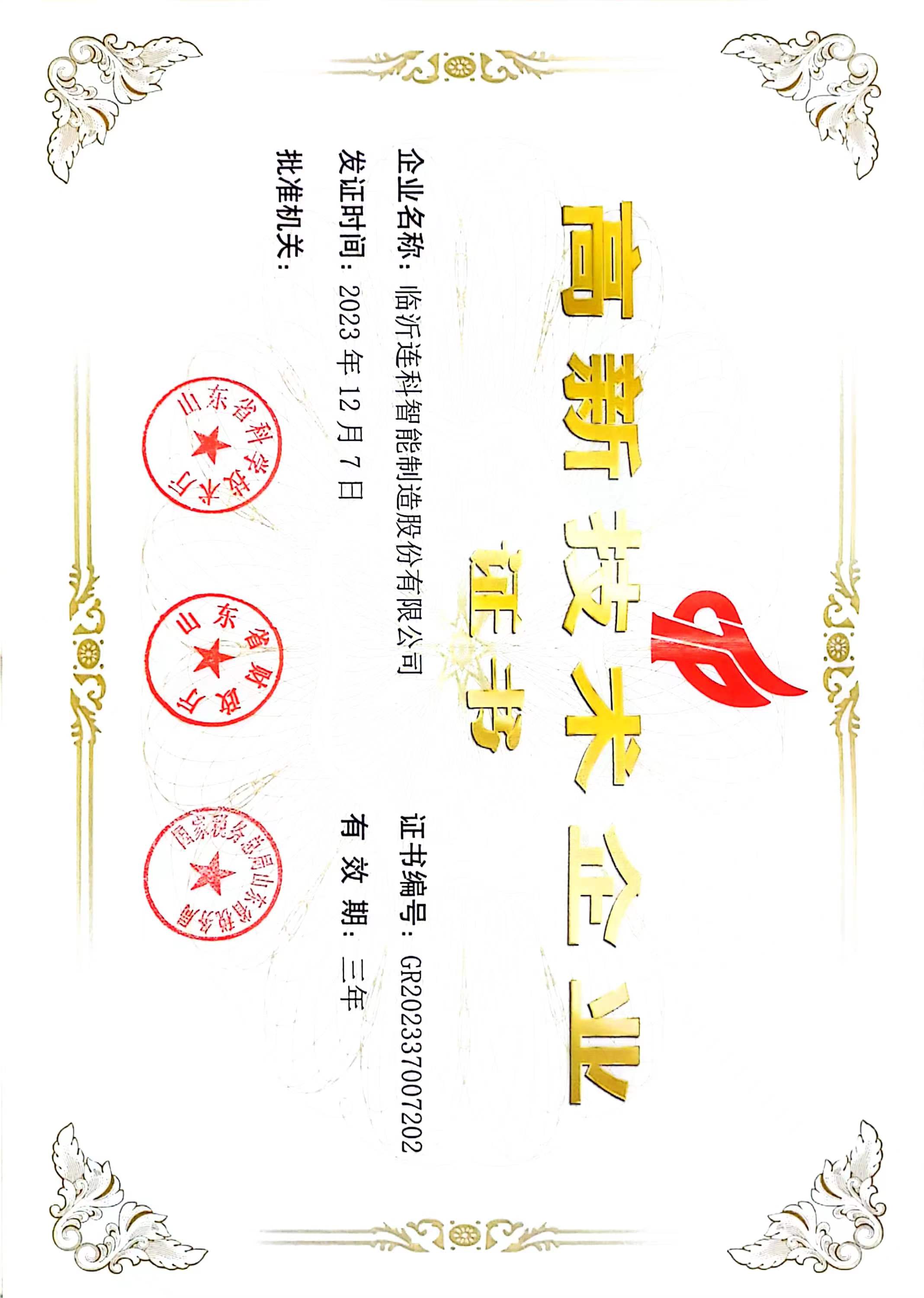 高新技术企业证书