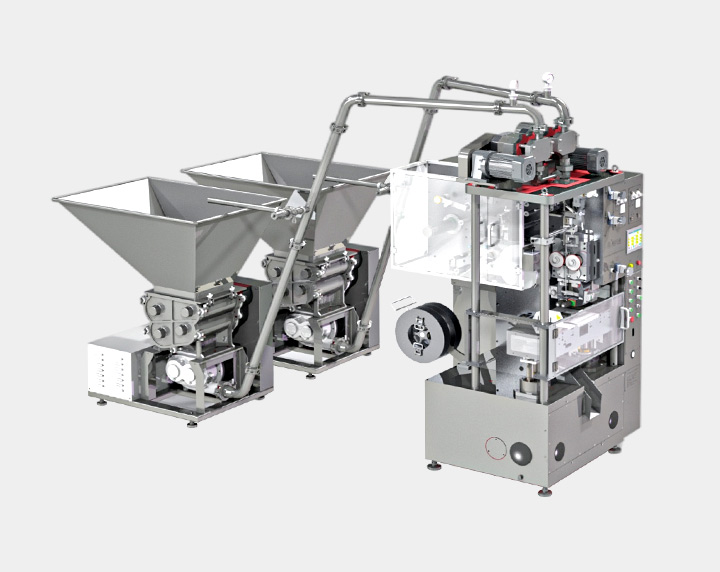 Easy-peel double filling sausage filler is an upgrade model which adds the function of double filling on basis of the single material filling at easy-peel type sausage filler, adopts unique double mixing device, makes up the defect of previous single filling with one taste, realizes double filling with multiple tastes and nutrition collocation of market diversification demand, the produced easy-peel sausage easy to open via the easy-peel strip, safe and hygienic for eating, overcome the defect of traditional retort sausage eating inconvenient .